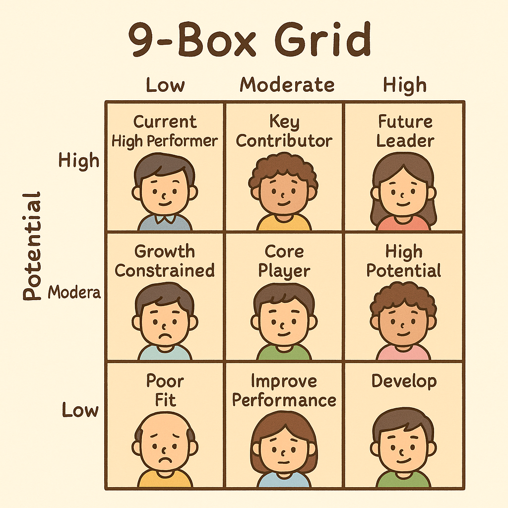 9 Box는 성과(Performance)와 잠재력(Potential) 두 축으로 인재를 9가지 유형으로 분류하는 평가 매트릭스입니다.