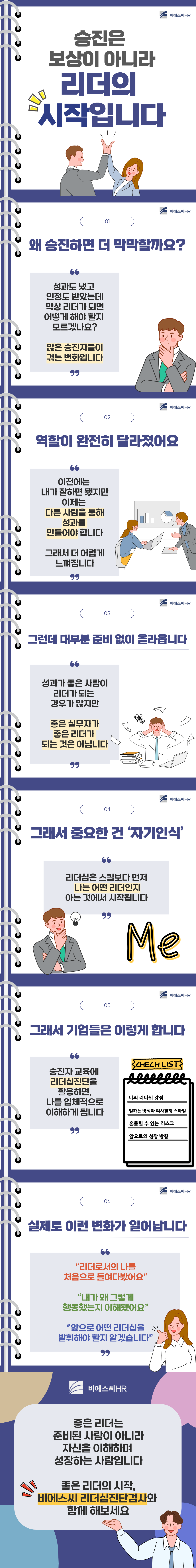 콘텐츠허브 블로그 승진은 '보상'이 아니라, 리더의 '시작'입니다! 2026-03-26 82 승진했는데, 왜 더 막막할까요?성과로 인정받아 올라왔지만,막상 리더가 되면 ‘이제 뭘 해야 하지?’ 싶은 순간이 옵니다.👉 그래서 많은 조직에서 승진자가 흔들립니다이번 카드뉴스에서는 좋은 리더가 되려면 ‘어디서부터 달라져야 하는지’를 핵심만 짚어드립니다!지금 바로 확인해보세요 👀(글: 비에스씨 연구소) 목록보기