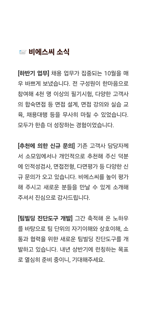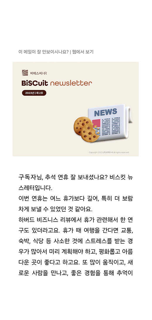 콘텐츠허브 뉴스레터 지금 바로 비에스씨 뉴스레터 <비스킷> 무료 구독을 신청하세요! 최고의 역량평가 전문기업 (주)비에스씨의 경험과 노하우를 담은 <비스킷 뉴스레터>를 받아보세요. <비스킷 뉴스레터>는 인사담당자님들을 위한 다양한 이야기를 제공하며, 매월 두 번 여러분의 메일함으로 전송됩니다. 구독하기 지난 뉴스레터 보기 비스킷 뉴스레터에서는 이런 이야기를 나눕니다. 자주 묻는 질문 메일함에 비스킷 뉴스레터가 들어와 있지 않아요. 프로모션함이나 스팸함에 자동 분류되어 있을 수 있어요. 드물게는 사용하시는 메일 서버에 서 자체적으로 필터링을 했을 수도 있습니다. 주소록에 contact@bschr.com을 추가해주시면 받을 메일함으로 잘 들어올거에요. 비스킷 뉴스레터의 이미지가 표시되지 않아요. 사용하시는 메일 클라이언트에 따라 이미지가 곧바로 표시되지 않는 경우가 있답니다. 이미지 위치에 마우스를 놓으시고 우측 버튼을 꾸욱 눌러주세요. 혹은 뉴스레터의 최상단의 '이 메일이 잘 안보이시나요? | 웹에서 보기 버튼을 눌러주세요! 비에스씨 뉴스레터 이름은 왜 '비스킷' 인가요? 비스킷의 영어 이름은 BiSCuit 입니다. 회사명 비에스씨의 영어 이름인 BSC의 이름을 담아서 지어진 이름이지요. 비에스씨의 일상과 노하우를 한잔의 커피와 함께 즐기는 비스킷처럼 편안하게 여러분과 공유했으면 좋겠다는 의미를 담고 있습니다. 비스킷 뉴스레터의 구독을 해지하고 싶어요. 언제든 쉽게 구독 해지를 하실 수 있어요. 뉴스레터 메일 하단에 있는 '수신거부 링크를 클릭하시면 바로 구독이 해지됩니다. 구독하기 지난 뉴스레터 보기 검색 번호 제목 다운로드 1 BSC 뉴스레터 2023년 2월 | VOL. 2 1